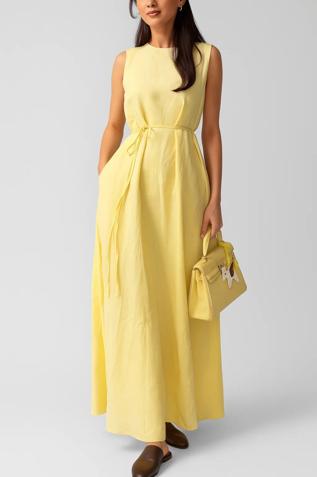 Sukienka Arielle to kwintesencja naturalnego, letniego stylu w eleganckim wydaniu. Uszyta z lekkiego lnu, ta długa sukienka zapewnia smukłą sylwetkę dzięki płynnemu krojowi oraz delikatnej, cienkiej tasiemce w talii. Idealna na ciepłe dni – łączy w sobie wygodę, świeżość i klasę.