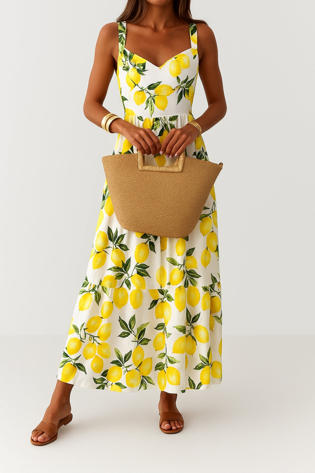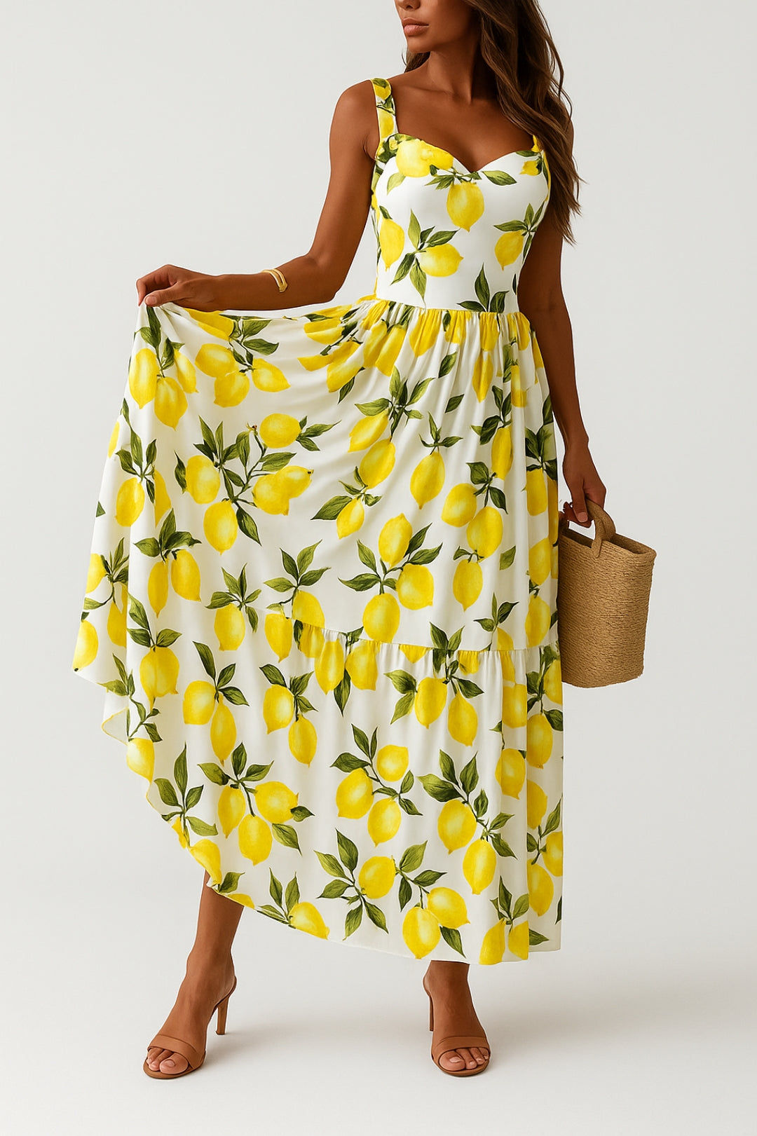 - Design: Długa sukienka z nadrukiem cytrynowym i szerokimi ramiączkami