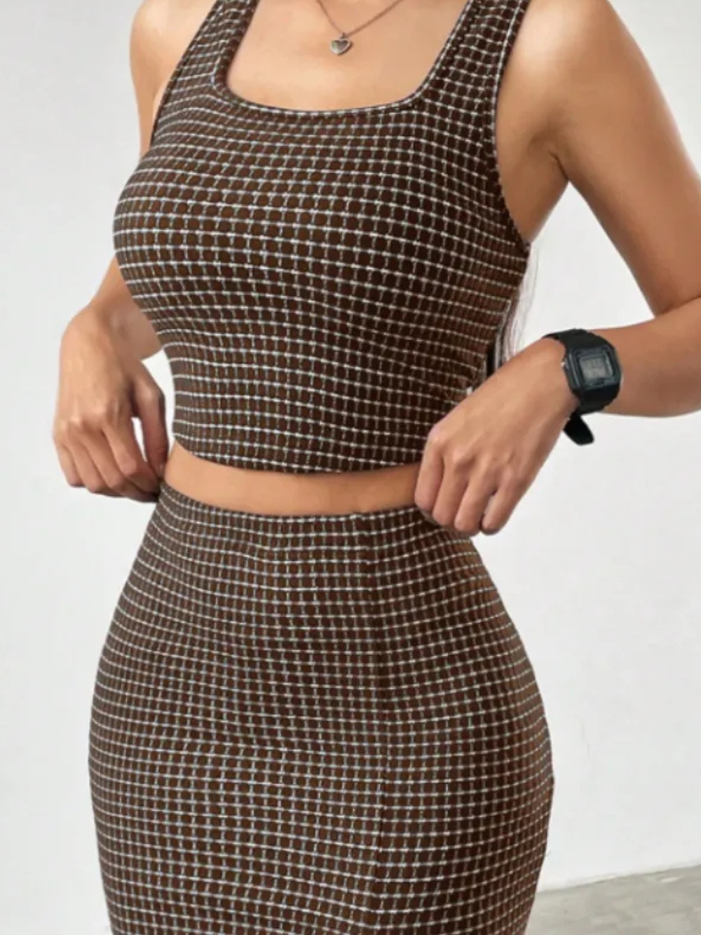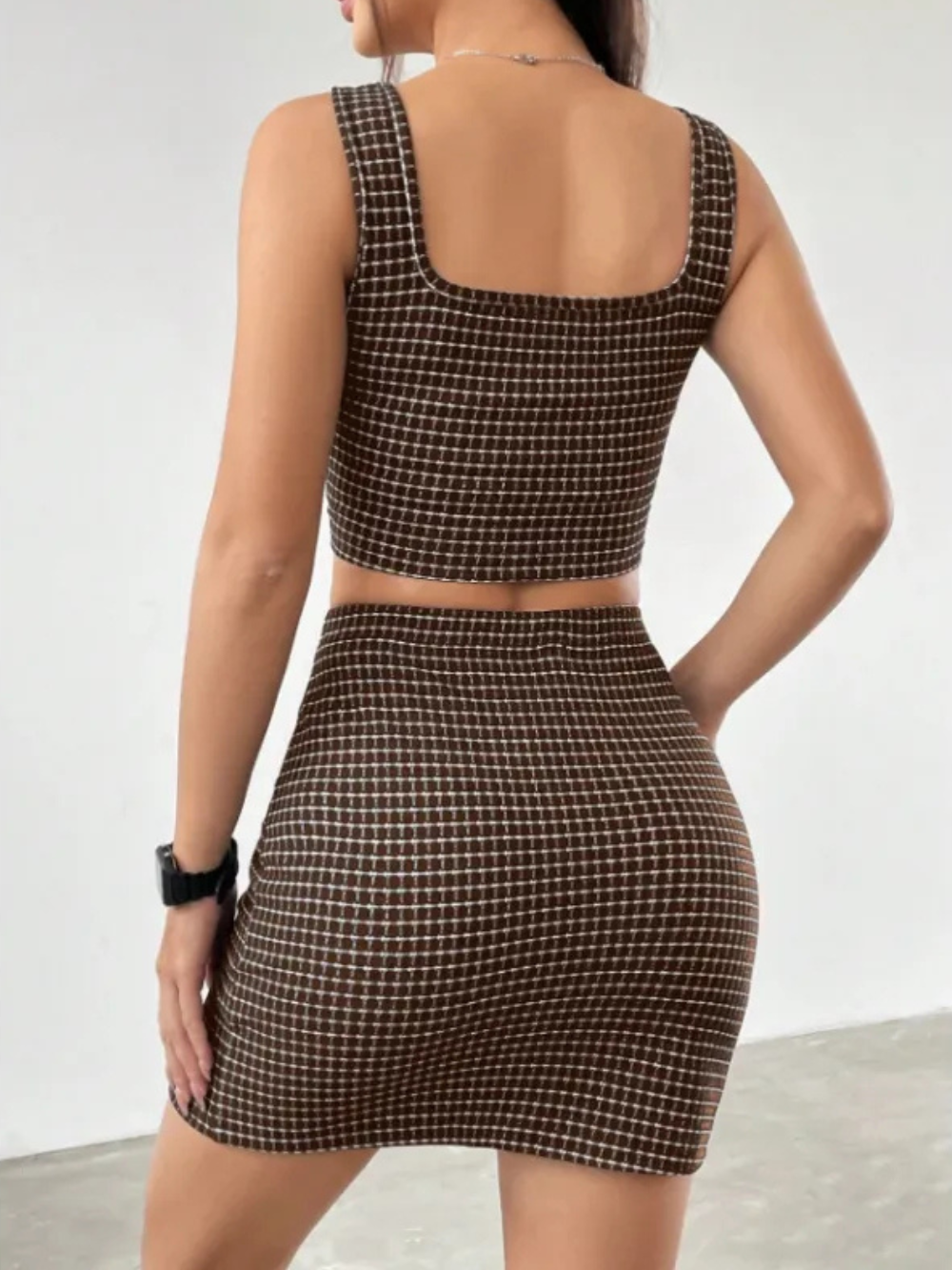 - Design: Taliowany żakiet z dopasowaną spódnicą w kratę