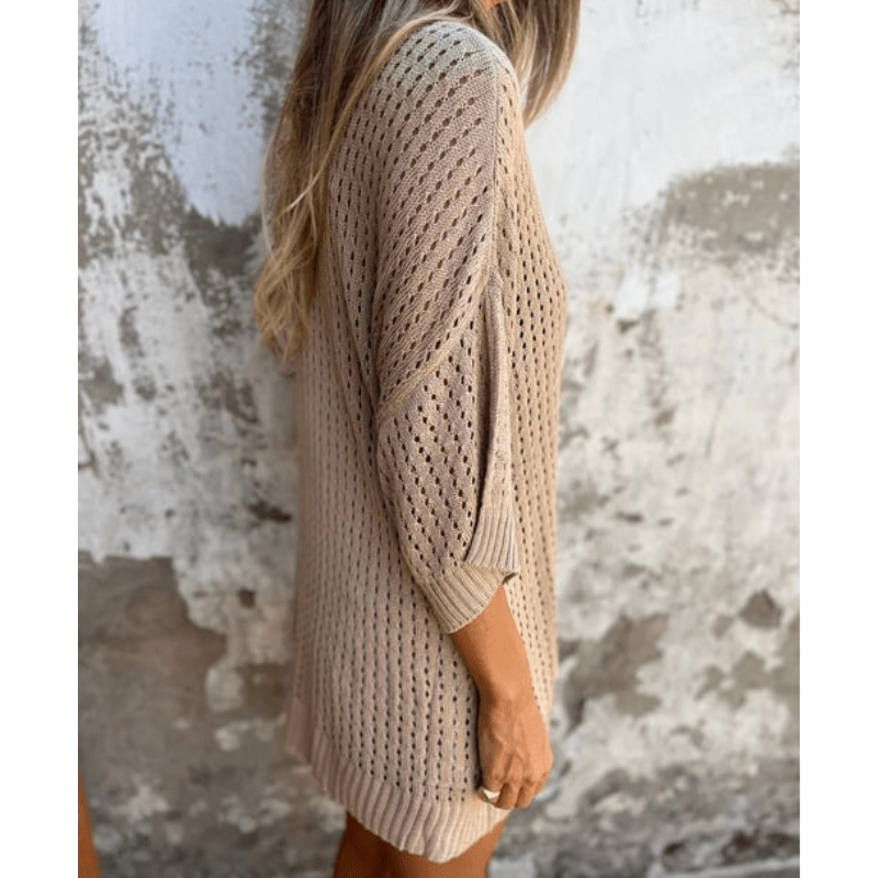 - Design: top z ażurowej dzianiny, trzy-czwarte rękawy i luźny krój