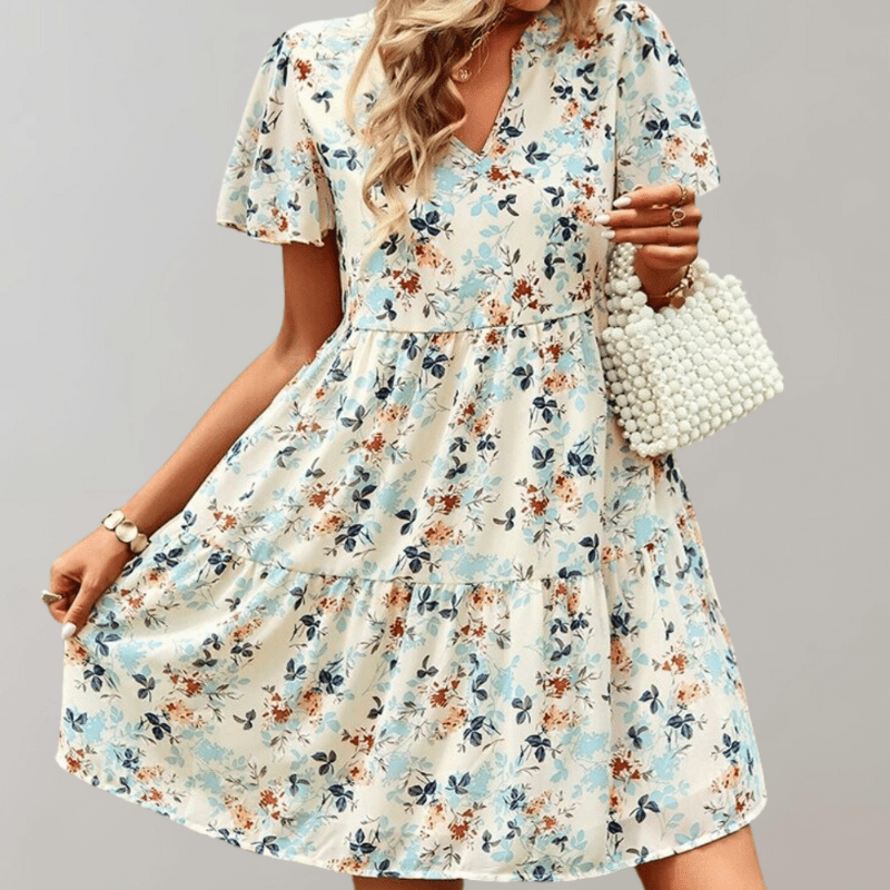 - Design: letnia sukienka z kwiatowym wzorem i falbaniastymi rękawami