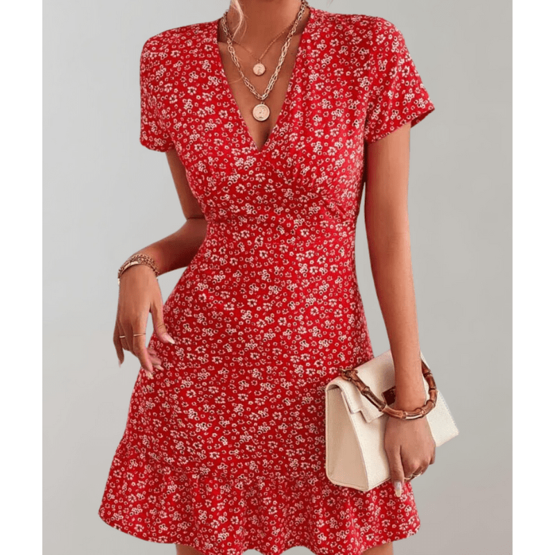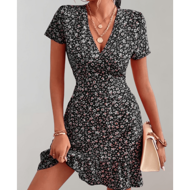 - Design: sukienka z kwiatowym wzorem, dekoltem w serek i falbanowym dołem