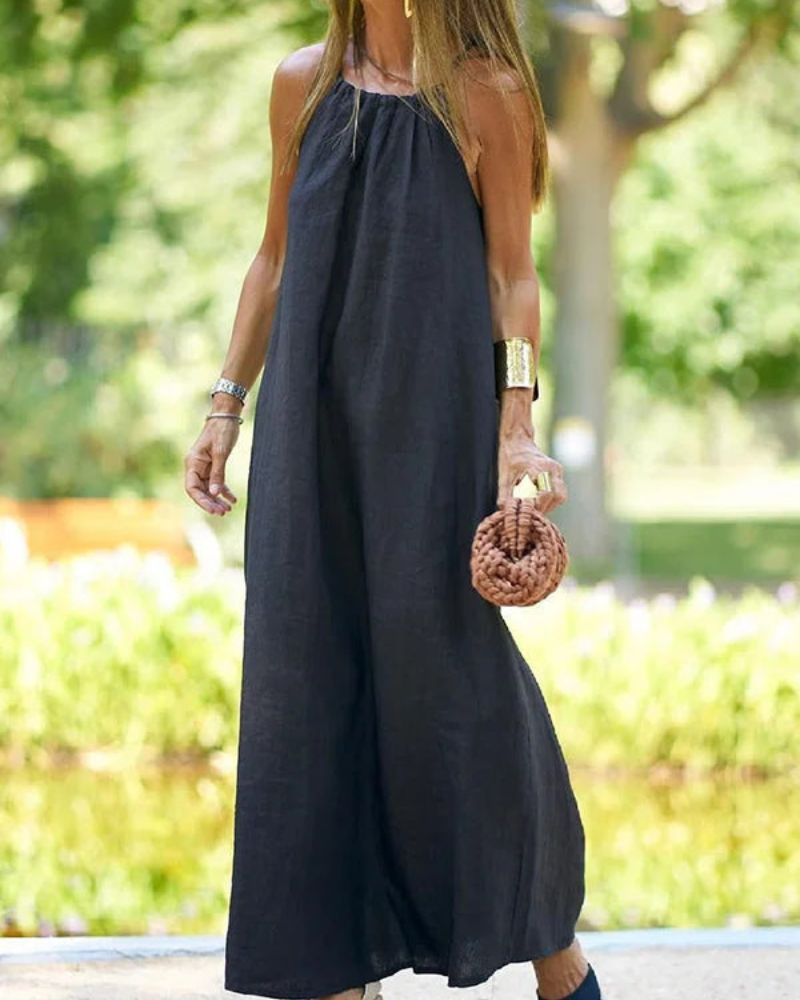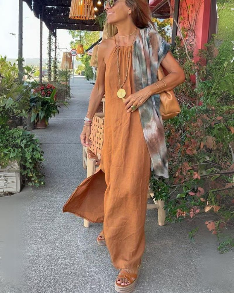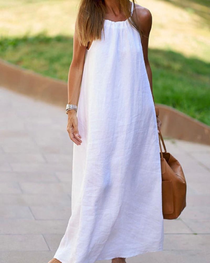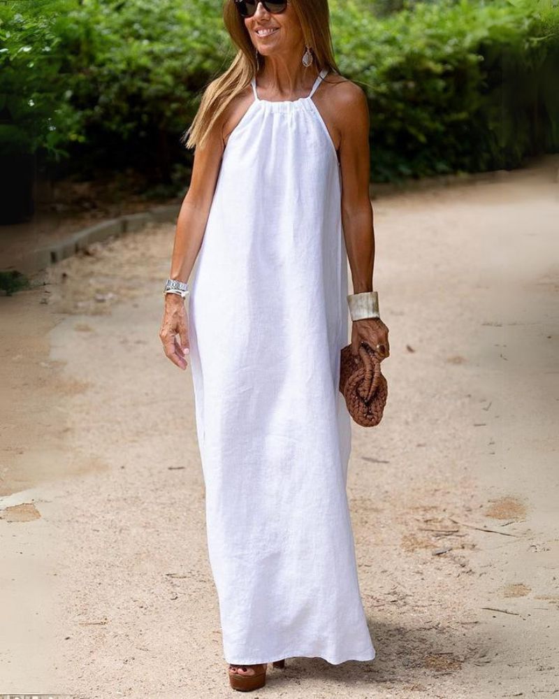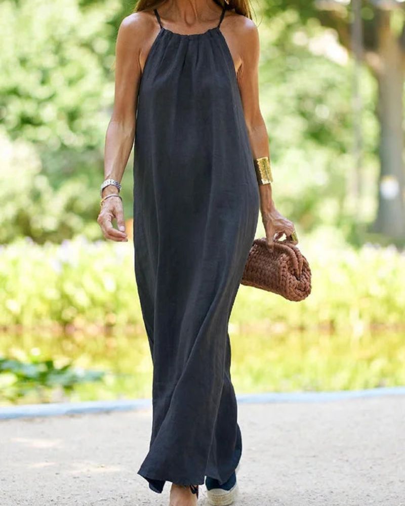 Długa Sukienka Viela – Elegancki Odsłonięty Tył z Lnu i Bawełny dla Lekkiego, Szykownego Looku