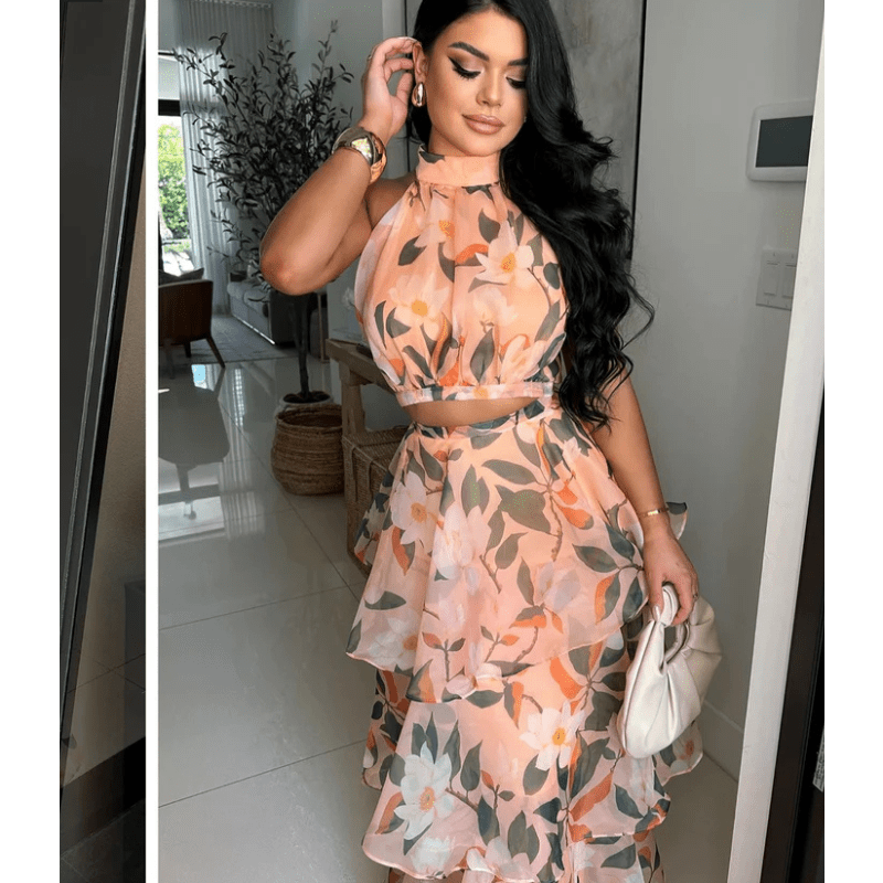 • Design: Sukienka maxi z kwiatowym wzorem i nałożonymi falbanami