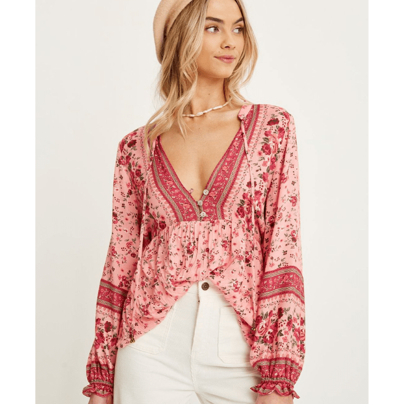 Rafaela Damska Tunika Looksy – Boho Wzór Kwiatowy, Zapinany na Guziki Dekolt w Serek i Zwiewny Krój