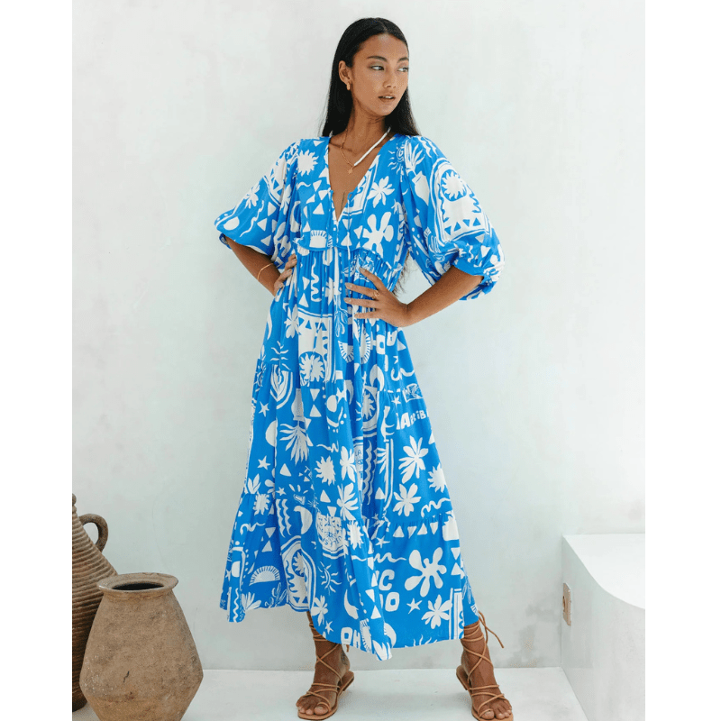 Rosina Długa Sukienka Looksy – Abstrakcyjny boho wzór i zwiewny, warstwowy fason