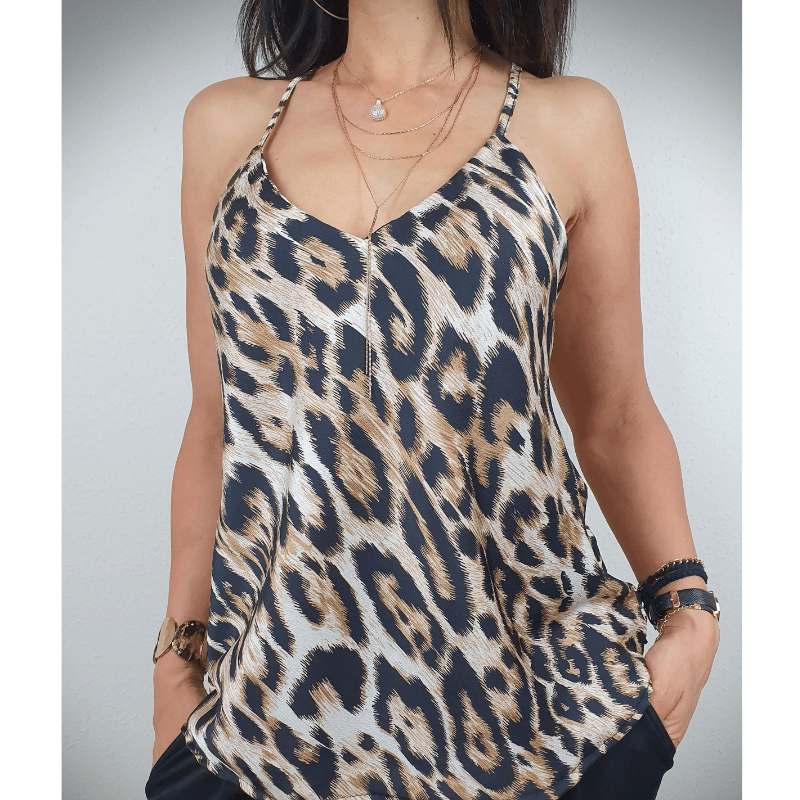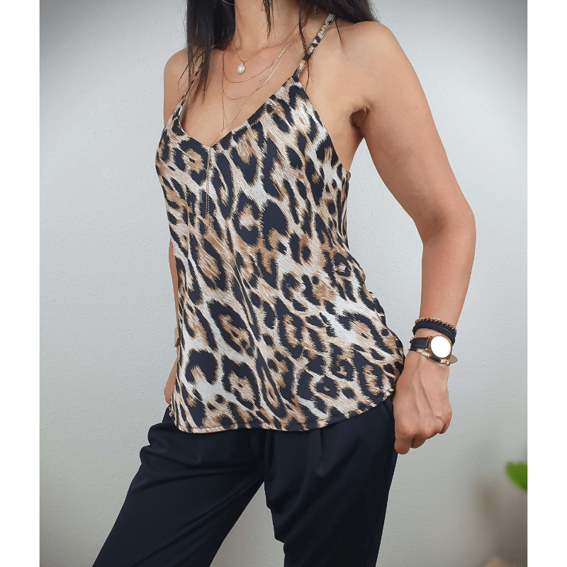 Sabrina Damski Top Looksy – Wzór Lamparta, Dekolt w Serek i Regulowane Ramiączka