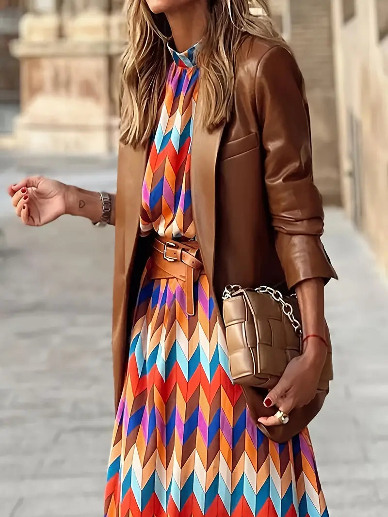 - Eleganckie detale: Stójka i całościowy nadruk dla szykownego wyglądu