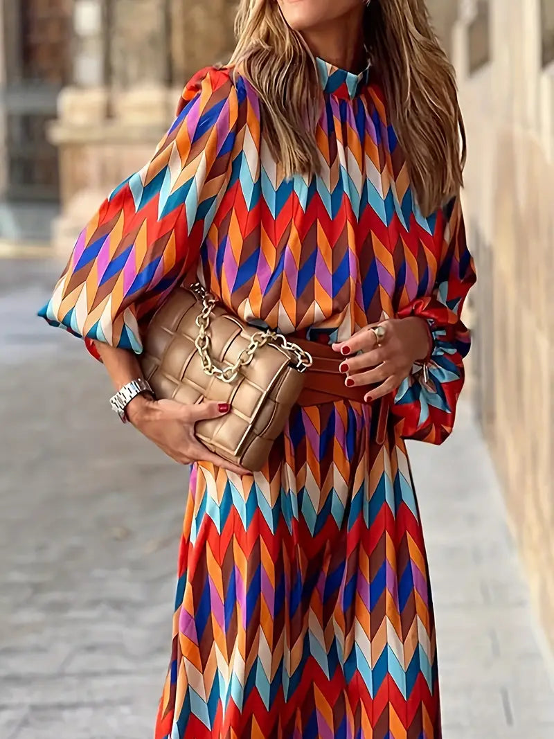 Sukienka Damska Molly – Elegancka Sukienka Midi z Bufiastymi Rękawami, Wzorem i Stójką