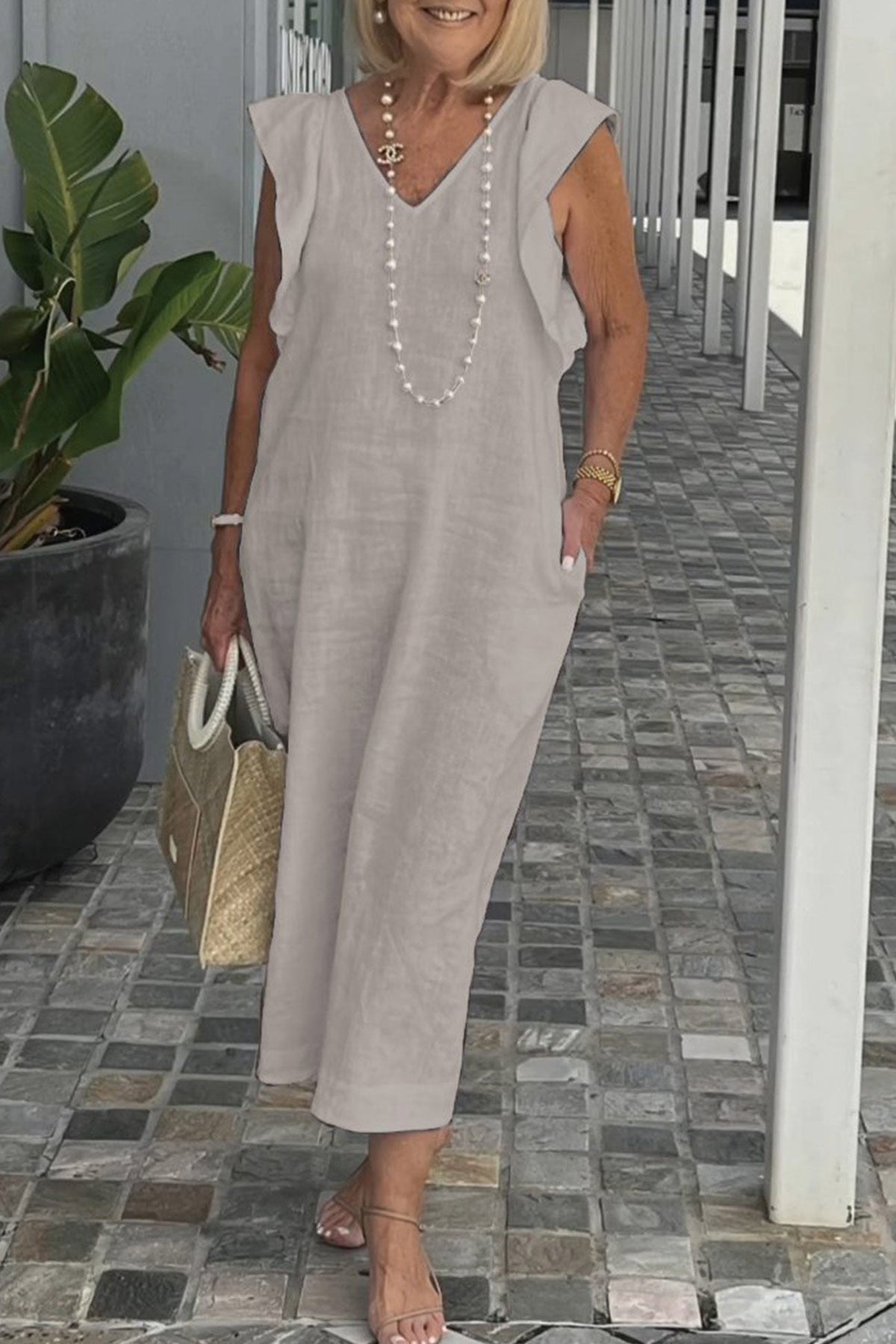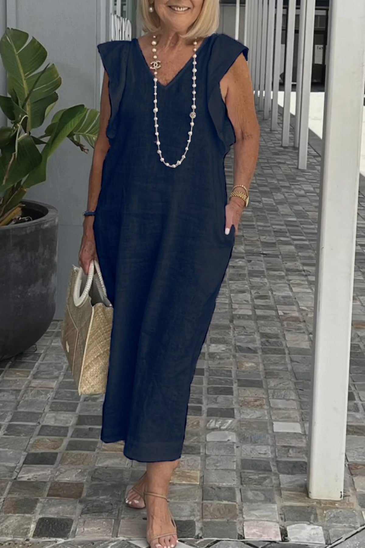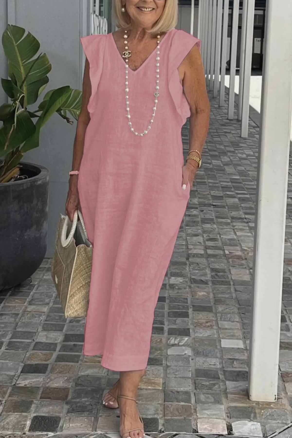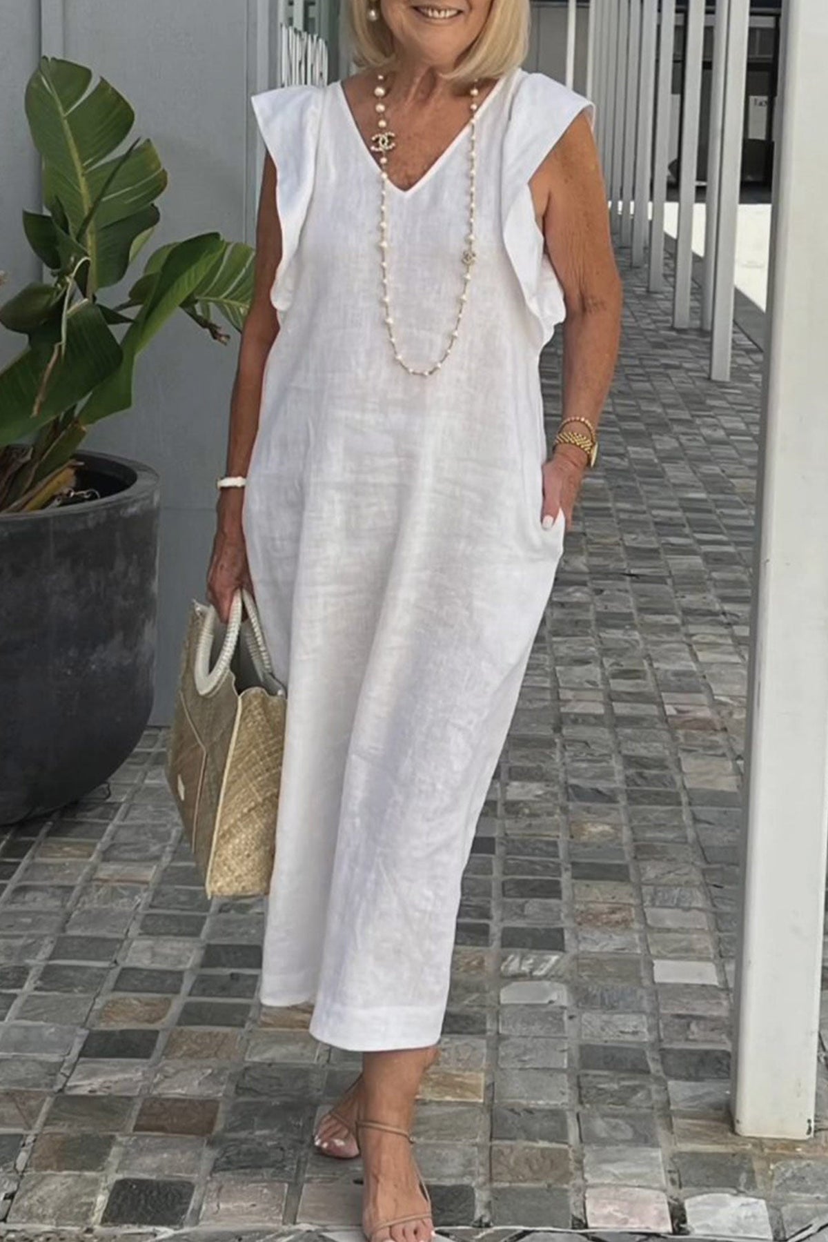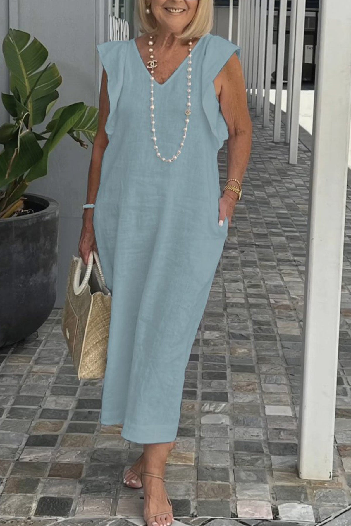 Sukienka Damska z Lnu Elise – Lniana Sukienka Midi Bez Rękawów z Dekoltem w Serek i Falbanami