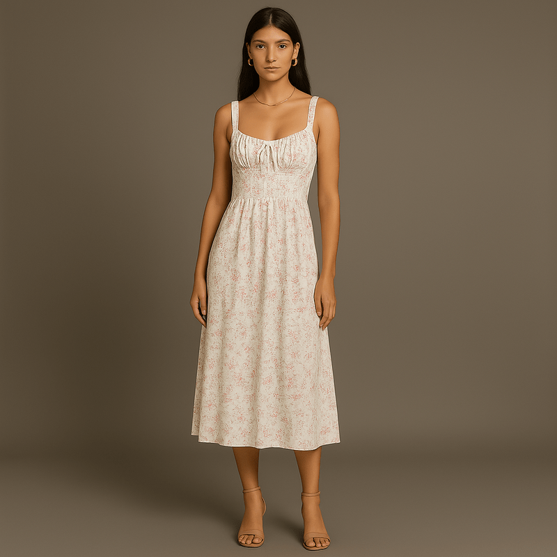 Dodaj romantycznego uroku swojej garderobie dzięki sukience midi Emelie. Zaprojektowana, by podkreślać każdą sylwetkę, ta kobieca sukienka posiada dopasowany gorset z delikatnymi marszczeniami na biuście oraz regulowane ramiączka dla idealnego dopasowania. Zwiewna spódnica nadaje naturalny ruch, co sprawia, że jest idealna zarówno na spacery w ciągu dnia, jak i na letnie wieczory. Dostępna w delikatnych pastelowych odcieniach i subtelnych kwiatowych nadrukach, ta sukienka to kwintesencja świeżości, kobiecości i ponadczasowej elegancji.