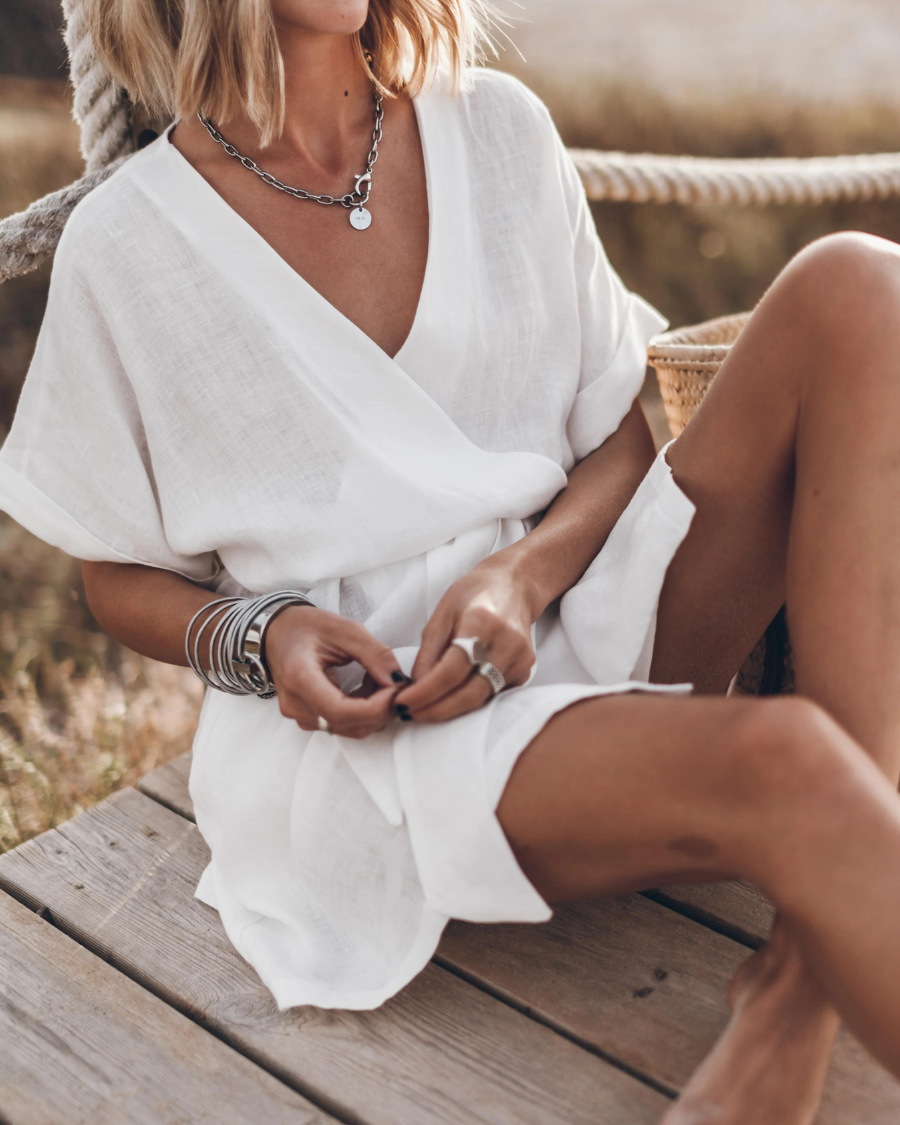 Zachwyć się dzikim urokiem sukienki kimono Anny wykonanej z lekkiego, przewiewnego lnu. Ten model w stylu boho łączy w sobie wolność, subtelność i odrobinę przygody. Szerokie rękawy i luźny krój inspirowany klasycznym kimono zapewniają maksymalny komfort i eleganckie podkreślenie sylwetki.