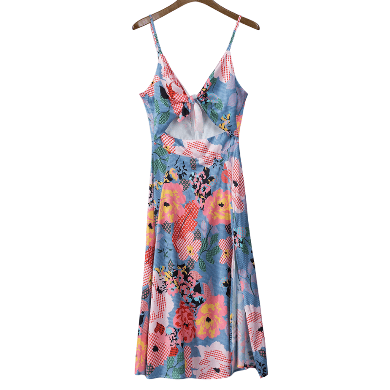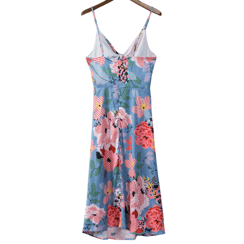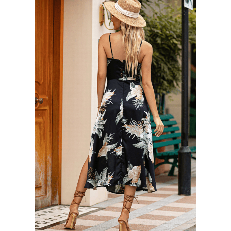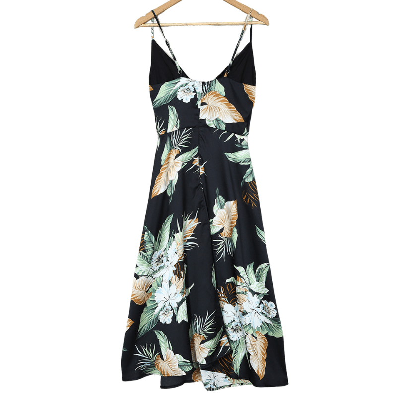 • Design: Sukienka midi z kwiatowym nadrukiem, regulowanymi ramiączkami i eleganckim rozcięciem