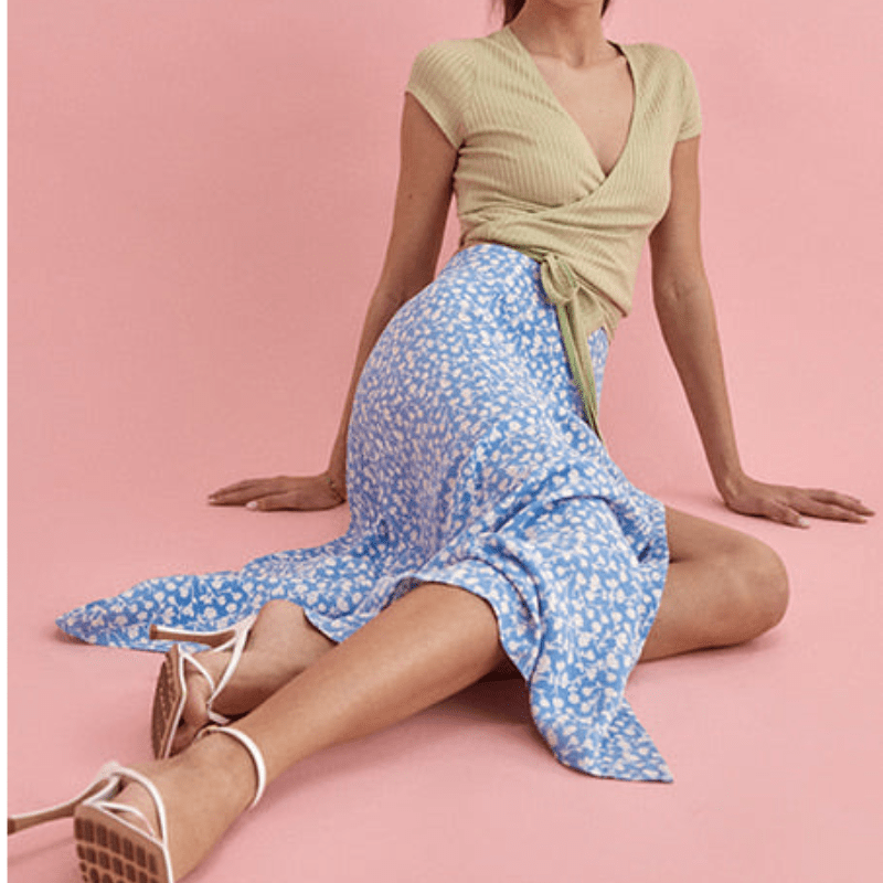 - Design: długa spódnica z wysoką talią i bocznym rozcięciem
