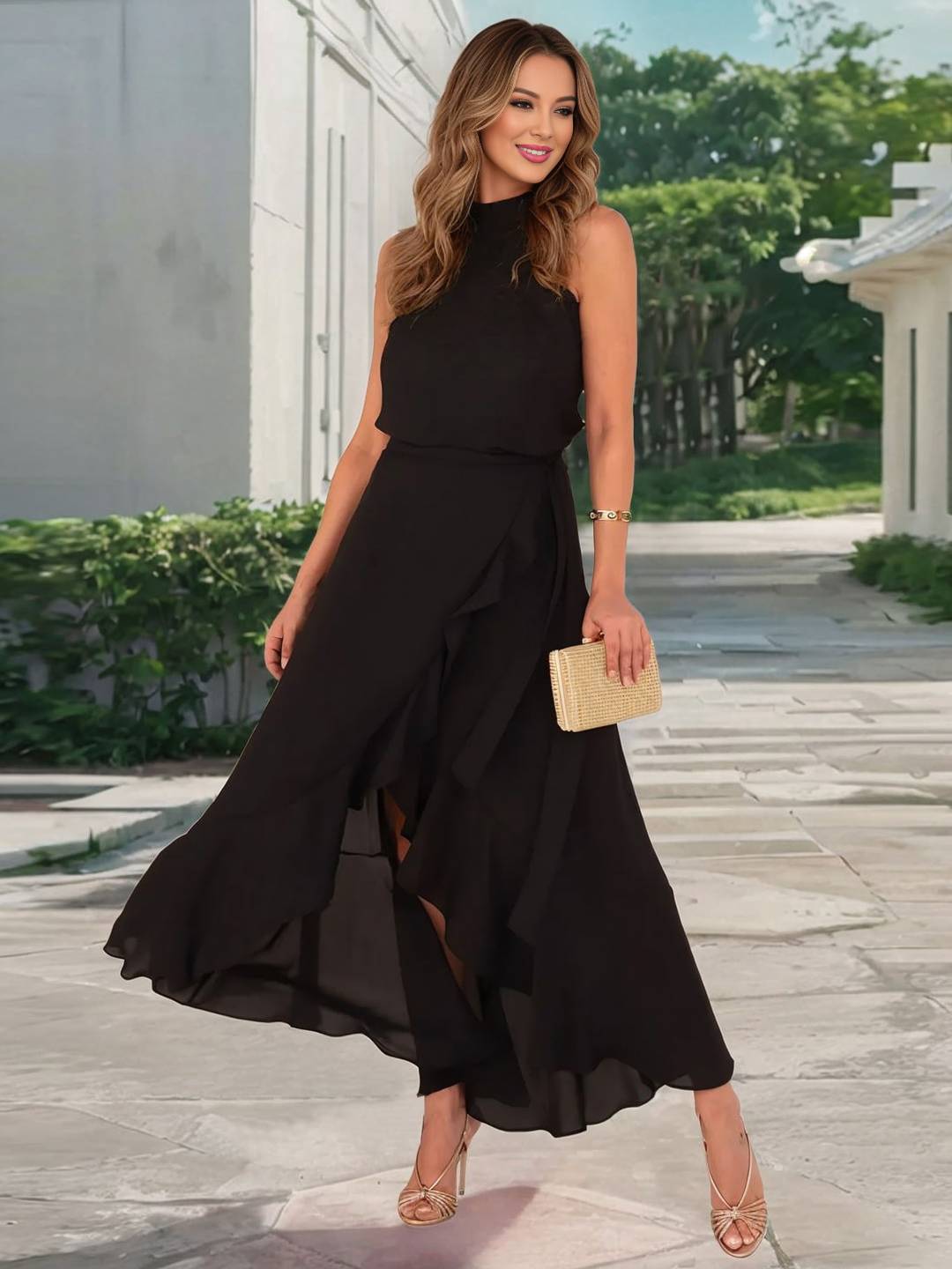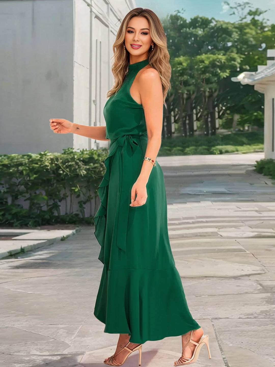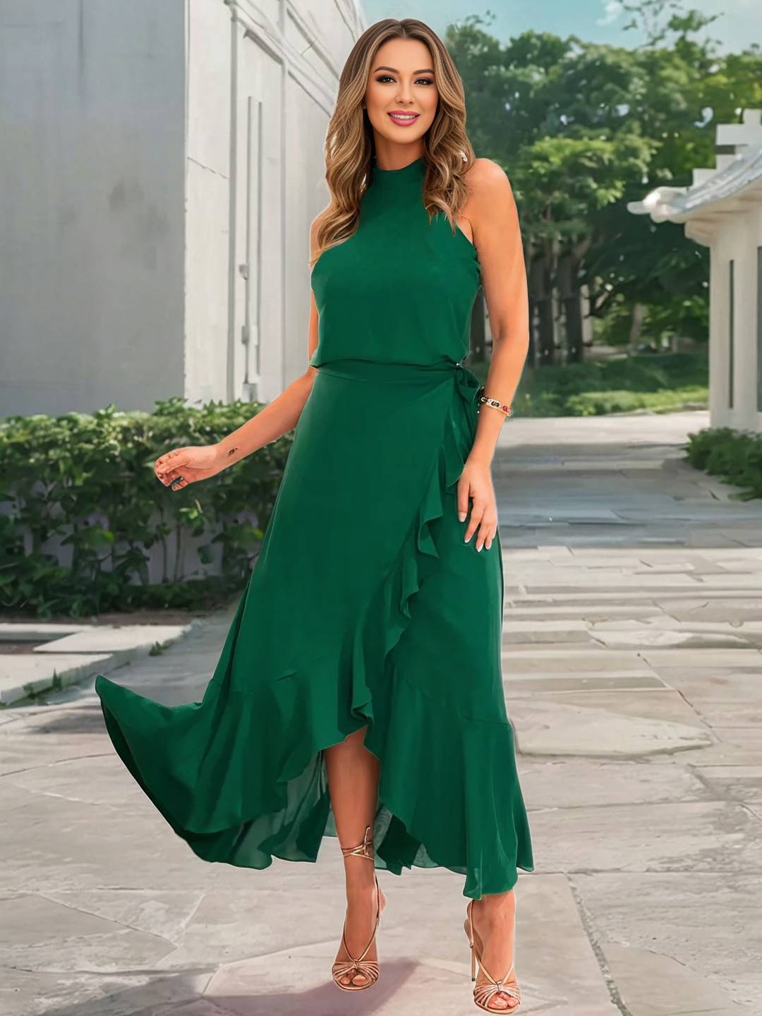 Yachi Sukienka Koktajlowa Damska – Długa Rozkloszowana Sukienka z Kołnierzem Halter, Rozcięciem i Falbanami